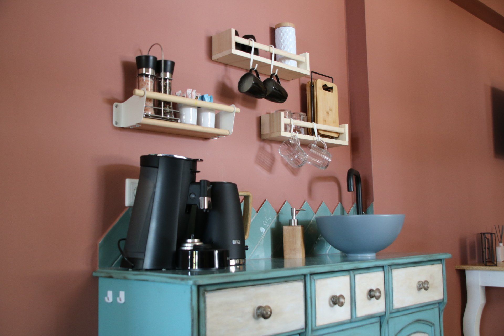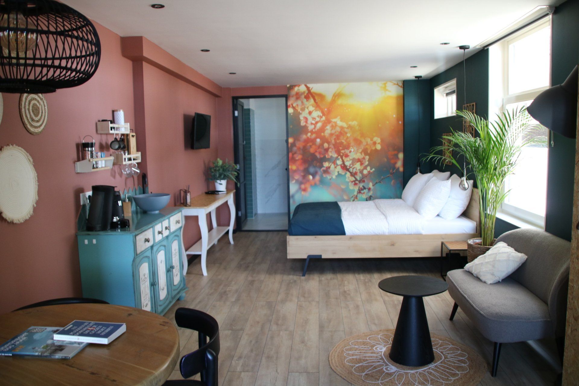 In de sfeervol en comfortabel ingerichte kamer staat een tweepersoons kingsize bed. Vanuit het bed kunt u tv kijken. Er is een kleine keuken waar u zelf koffie en thee kunt zetten en een kleine koelkast.